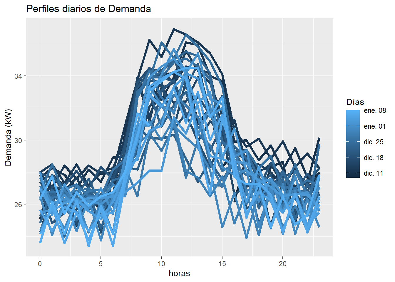 La demanda diaria máxima se muestra de manera constante alrededor de las 12 hrs todos los días de la semana con una demanda máxima de 36.92 kW. La demanda mínima se presenta de las 8 pm a las 5 am con una demanda mínima de 23.42 kW, en promedio se presenta una demanda de 28.57 kW. Este perfil de demanda se muestra de manera casi constante todos los dias de la semana y con un comportamiento similar al mes pasado.