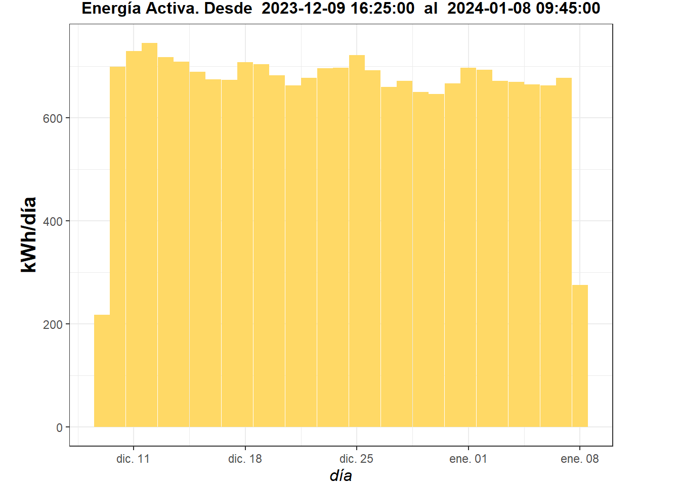 El consumo de energía en kWh sigue un perfil casi constante diario de 700 kWh, consumo típico de una carga que opera de manera continua las 24 hrs del día los 7 dias de la semana.